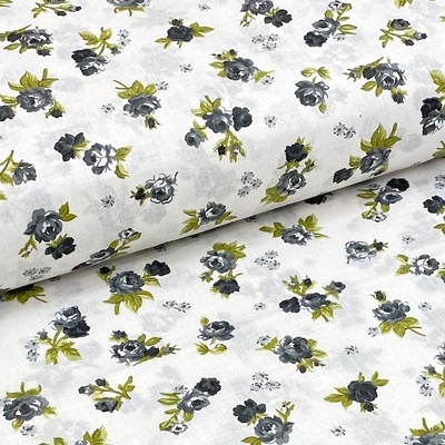Bavlněná látka (tkanina) s motivem šedých květinek na bílé. Látka je v šířce 160 cm, vyrobena ze 100% bavlny (gramáž 135g/m2) v plátnové vazbě. Vzor látky je natištěn jen z...