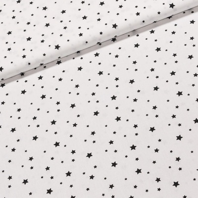 Bavlněná látka (tkanina) se vzorem různě velkých černých hvězdiček na bílém podkladu. Látka je v šířce 150 cm, vyrobena ze 100% bavlny (gramáž 120g/m2) v plátnové vazbě. Vzor...