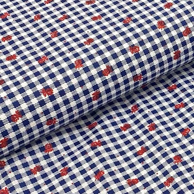 Vzorované bavlněné plátno, modro-bílé káro, červené tečky a kytky. Složení látky 100% bavlna. Metráž má šířku 140 cm. Bavlněné látky se používají ke zhotovení šatů, sukní,...