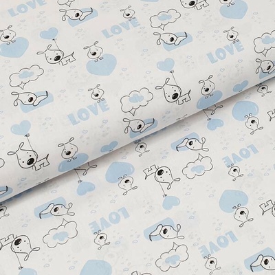 Bílé bavlněné plátno, motiv pejsci, světle modrá srdíčka a nápisy LOVE. Složení látky 100% bavlna. Metráž má šířku 140 cm. Bavlněné látky se používají ke zhotovení šatů, sukní,...