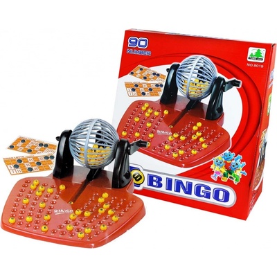 Stolní společenská hra Bingo. Herní set obsahuje plastový mechanický losovací stroj, míčky, žetony a karty. Kompletní bingo losovací stroj s 90 očíslovanými míčky, 120 žetony a 48 hracími kartami. Vyrobeno z plastu a kartonu. Vhodné pro děti od 4 let, hrát mohou 2...