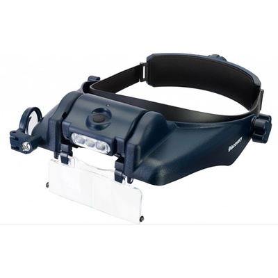 Brýlová binokulární lupa s LED osvětlením a třemi plastovými výměnnými dvojčočkami se zvětšením 1,5 x; 2,5 x; a 3,5 x, o rozměrech 28 x 74 mm. Osvětlení - vysoce svítivá bíla LED dioda a spinač. Napájení - 3 ks knoflíkových baterií LR 1130 (I 1131, 389, 390), výměna po...
