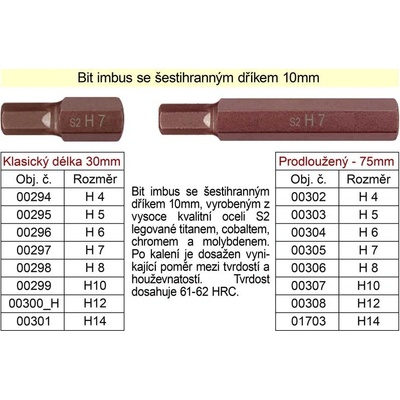 Bit imbus se šestihranným dříkem 10mm, vyrobeným z vysoce kvalitní oceli S2 legované titanem, cobaltem, chromem a molybdenem. Po kalení je dosažen vynikající poměr mezi tvrdostí a houževnatostí. Tvrdost dosahuje 61-62 HRC.