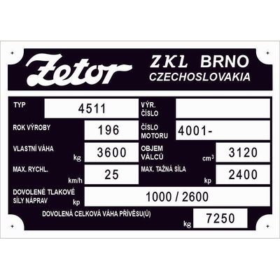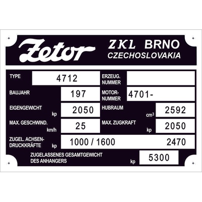 Sada štítků Zetor 25, Z25Vše věrná replika původních štítku.Provedení elox. hliník. Doživotní záruka na černou barvu.