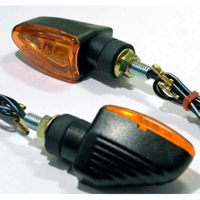 Blinkry na moto SHIN-YO Nova univerzální blinkry na motocykl černé s oranžovým sklíčkem osazeny čirými halogenovými žárovkami 12V 6W včetně napojovacích kabelů s konektory...