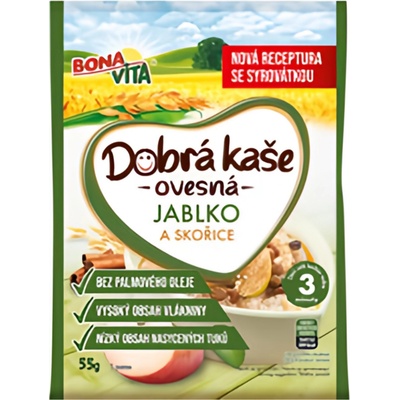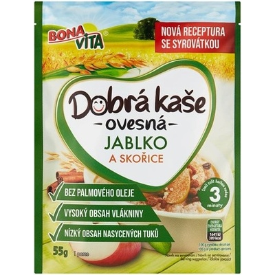 Bonavita Dobrá kaše ovesná s jablky a skořicí 55 g Ovesná kaše s jablkem a skořicí krásně zahřeje a přitom potěší chuťové pohárky. Směs obilovin pro přípravu ovesné kaše....