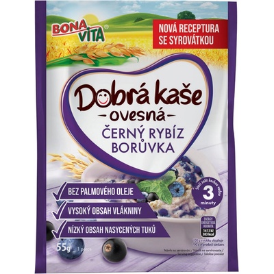 Bonavita Dobrá kaše ovesná borůvka a černý rybíz 55 g Na snídani nebo svačinu. Složení: celozrnné ovesné vločky 62 %, sušená syrovátka 11,7 %, glukózový sirup, třtinový cukr...
