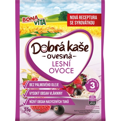 Lehký a chutný start do nového dne s příchutí lesního ovoce BONAVITA Dobrá kaše ovesná Lesní ovoce 55 g je ideální volbou pro ty, kteří hledají rychlou, chutnou a vyváženou...