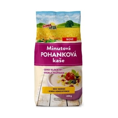 BonaVita Minutová pohanková kaše 250 g. Rychlá příprava bez vaření a s vysokým obsahem vlákniny. Složení: Pohanková mouka 91 %, cukr. Výrobek může obsahovat stopy lepku, sóji,...