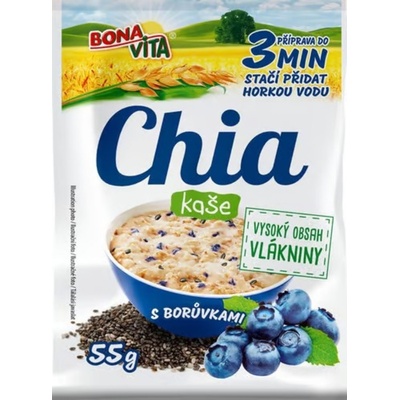 Bonavita Chia kaše ovesná s borůvkami 55 g. Instantní ovesná kaše s borůvkami a chia semínky. Příprava je velmi snadná a rychlá, stačí zalít horkou vodou. Složení: Ovesné...