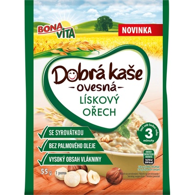 Bonavita Dobrá kaše lískový ořech se syrovátkou 55g Složení: celozrnné ovesné vločky 58%, sušená syrovátka 12,1%, glukózový sirup, lískové ořechy 5%, kukuřičný škrob,...