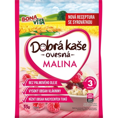 Bonavita Dobrá kaše ovesná jahoda 55 g Na snídani nebo svačinu. Složení: celozrnné ovesné vločky 62 %, sušená syrovátka 12,5 %, fruktóza 6,8 %, glukózový sirup, kukuřičný...