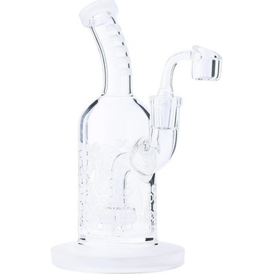 Průhledný skleněný bong s perkolací - Heatex Glass s motivem včelí královny a včelích pláství Bee Hex. Z vysoce kvalitního borosilikátového skla. Výška 18cm.
