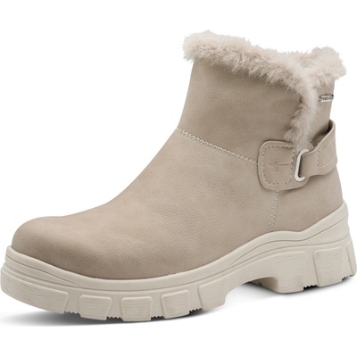 Dámské zateplené kotníkové boty Tamaris na pohodlné platformě. Kombinace hladkého kulatého vzoru s gumou po straně vypadá nápaditě. Díky bytelné podrážce jsou ideální ke...