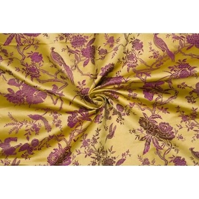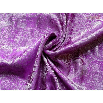 Fialový brokát se stříbrnou výšivkou. používají se na společenské oděvy - saka, sukně apod., historické kostýmy a také se používají k dekoračním účelům.