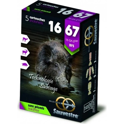Balení 5 ks prémiového brokového střeliva od francouzského výrobce Sauvestre. Každý náboj obsahuje podkaliberní jednotnou střelu BFS (Balle Fleche Sauvestre = šípová střela...