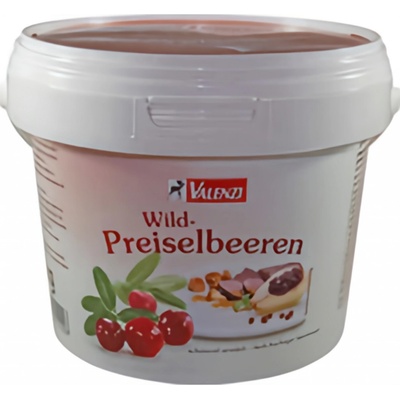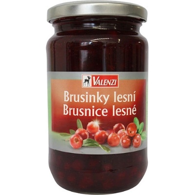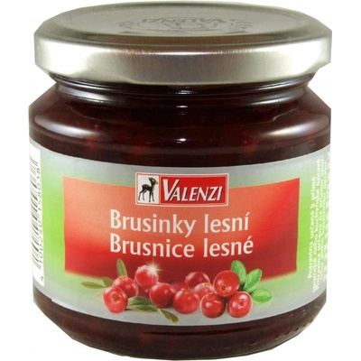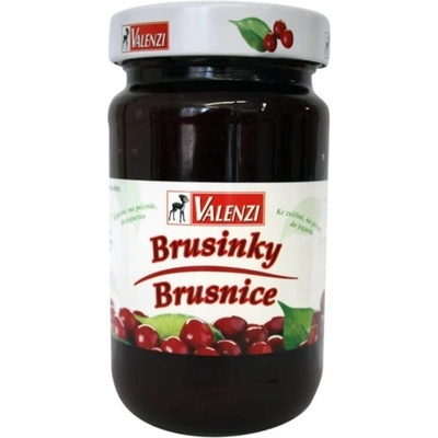 Valenzi Brusinky lesní 220 g. Hutná brusinková pomazánka. Složení: brusinky lesní (50 %), cukr, glukózo-fruktózový sirup, pitná voda, želírující látka: pektin. Regulátor kyselosti: kyselina citronová Země původu: Německo