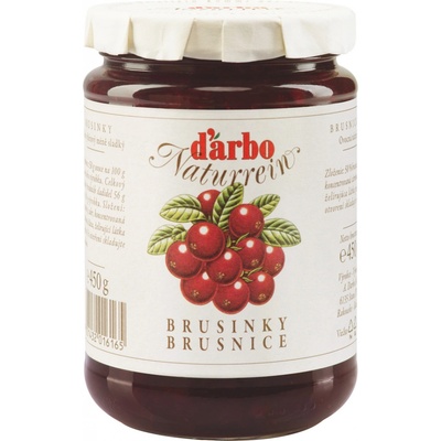 Džem divoké brusinky d'arbo 450g Složení :brusinky, cukr, koncentrovaná citrónová šťáva, želírující látka pektin. Výživové údaje na 100g :energetická hodnota (kJ)984energetická hodnota (kcal)223tuky (g)0,z toho nasycené mastné kyseliny (g)0,0sacharidy (g)54z toho cukry...