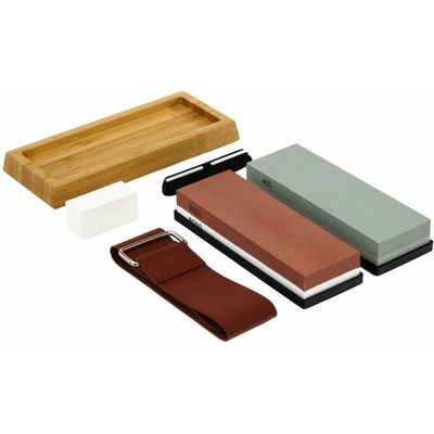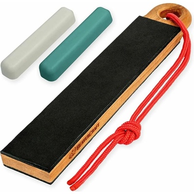 Oboustranná dřevěná deska s kůží a dvěma brusnými pastami zajistí, že budou vaše nože budou opět ostré. Kůže je ideálním pomocníkem při broušení a udržení maximální ostrosti...