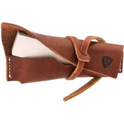 Brusný kámen fylit se zrnitostí 1000 od finského výrobce Marttiini uložený v hnědém koženém pouzdře.