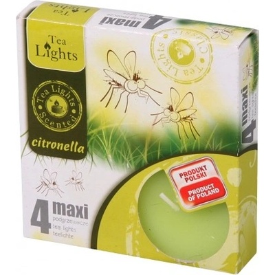 Velké žluté čajové svíčky s vůní citronella v hliníkovém kalíšku. Baleno po 4 kusech v papírové krabičce s obrázkem komárů a citronové trávy. Velikost krabičky: 12 x 12 x 2,5 cm.