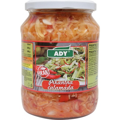 ZÁKONNÝ NÁZEV POTRAVINY Pikantní čalamáda v kořeneném sladkokyselém nálevu s cukrem a sladidlem SLOŽENÍ kapusta (60%), paprika (20%),pitná voda, uhorky (10%), cibule (6 %),ocet...