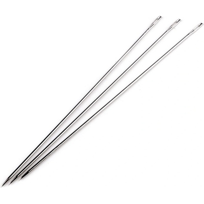 Dlouhá čalounická jehla s velkým ouškem. Rozměry ouška jsou cca 1,5 x 8 mm.