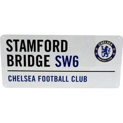 Plechová cedule Chelsea FC v bílé barvě. Černý nápis Stamford Bridge SW6 odkazuje na domácí stadion tohoto fotbalového klubu. Ve spodní části tmavě modrou vyvedený název klubu....