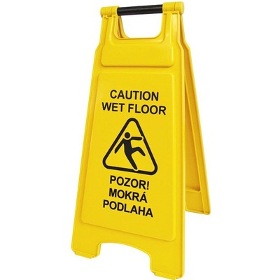 Plastový stojan žluté barvy s oboustranným mezinárodně známým symbolem upozorňuje na mokrou, kluzkou podlahu s nebezpečím uklouznutí a možného zranění. - výstražný plastový...
