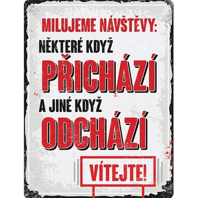 Plechová cedulka Milujeme návštěvy je stylová retro dekorace, která v sobě snoubí vtip i praktičnost. Na ceduli je napsáno: „Milujeme návštěvy: některé, když přichází a jiné,...