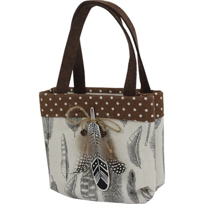 Nádherná taška s motivem Pírka + dekorace / hnědo-bílá. Materiál: Filc + bavlna. Taška je vhodná na sladkosti, bonbóny nebo různé drobnosti.Doplňující popis:17 x 9,5 x 15,5 cm