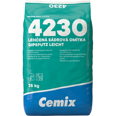 Sádrová omítka Cemix 4230 je vhodná pro stěny i stropy, s dobrou tepelnou izolací.