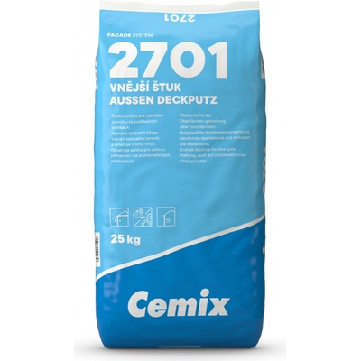 Cemix 2701 vnější štuková omítka. Vnější štuk se používá pro finální povrchovou úpravu jádrových omítek nebo hladkých betonových podkladů. Pro sjednocení struktury povrchu a k...