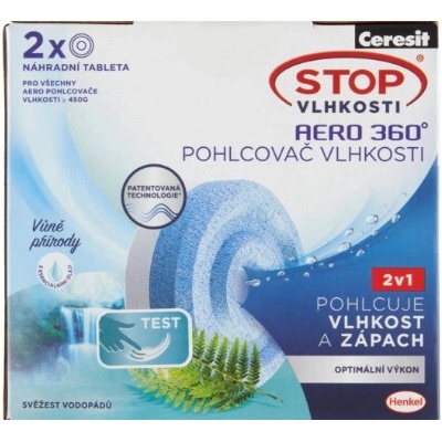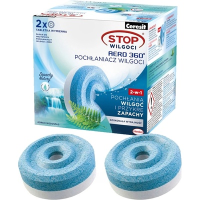 Popis Ceresit Stop Vlhkosti Aero 360° Náhradní tablety – Svěžest vodopádů 2 × 450 g (900 g)2v1 – Pohlcuje vlhkost a zápach + provoní váš domov svěžestí přírodyDopřejte svému...