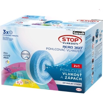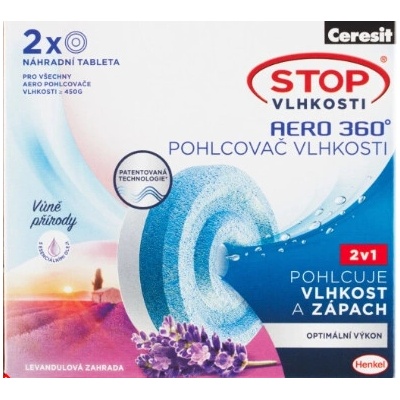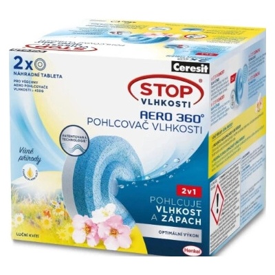 Popis Ceresit Stop Vlhkosti Aero 360° Náhradní tablety - luční kvítí 2 × 450 g (900 g)2v1 – Pohlcuje vlhkost a zápach + provoní váš domov svěžestí přírodyDopřejte svému domovu...