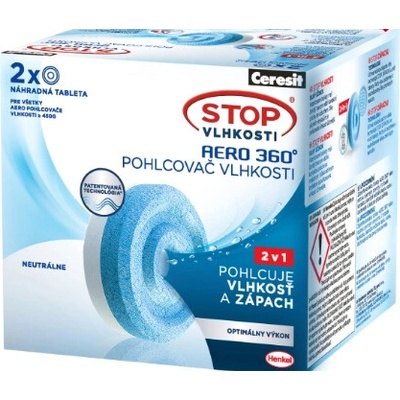Náhradní tablety Ceresit Stop vlhkosti Aero 360. Nový systém společnosti Henkel optimalizuje vzdušnou vlhkost prostřednictvím 360° cirkulace vzduchu. Zajišťuje vysoký účinek pohlcování vlhkosti a neutralizaci pachu. Unikátní 360° cirkulace vzduchu Systém Aero 360°...