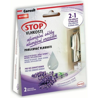 CERESIT STOP VLHKOSTI - ABSORPČNÍ SÁČKY Popis výrobku: Absorpční sáčky s vůní levandule jsou vhodné k regulaci vlhkosti v malých uzavřených prostorech, jako jsou zásuvky, šatník, botník, automobil apod. Speciální tkanina na povrchu propouští vlhkost pouze dovnitř a...