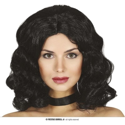 Kvalitní dámská černá retro paruka se zvlněnými vlasy vhodně doplní Váš převlek na retro párty ve stylu 20. a 30. let minulého století.