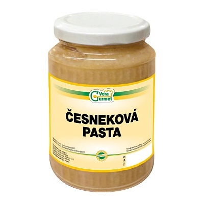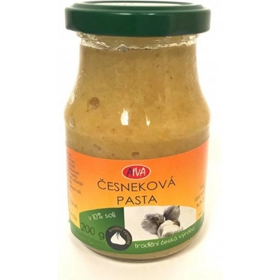 Sterilovaná česneková pasta. Složení: česnek 90%, jedlá sůl 10% Výrobce: Aiva s.r.o., Dluhonská 101, 750 02 Přerov