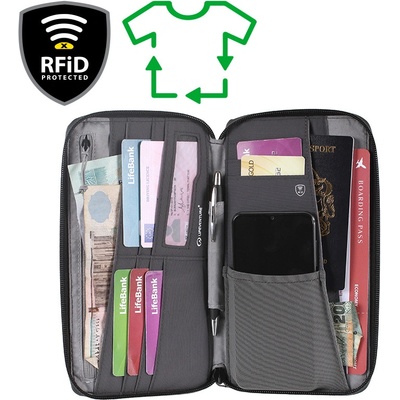 Praktické cestovní pouzdro na dokumenty a doklady, vyrobené z recyklovaného materiálu a s kompletní RFiD ochranou. Voděodolné pouzdro nabízí jednu venkovní kapsu (bez RFiD...