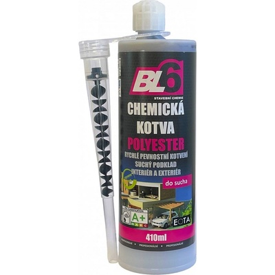 Charakteristika BL6 chemické kotvy polyester - kartuše 410ml Dvousložková polyesterová chemická malta bez styrenu. Malta nemá rozpěrnou sílu, má velkou mechanickou pevnost,...