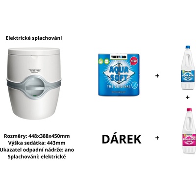 Přenosné WC THETFORD Porta Potti Excellence Electric -má vestavěny držák toaletního papíru, integrovaný panel s indikátorem ukazatele hladiny nádržky splachování. Tento model má...