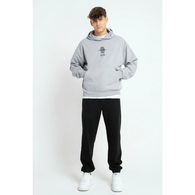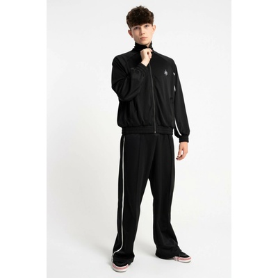 Černé teplákové kalhoty s minimalistickým potiskem z česané bavlny volný střih, rovné nohavice, mírně se zužující směrem dolů, spodní lem nohavic zakončený žebrovaným lemem, v...