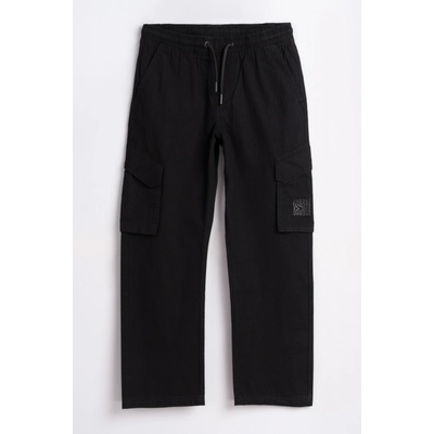 Chlapecké černé tepláky s našitými kapsami s gumou v pase, vyrobené z vysoce kvalitní česané bavlny - volný střih, - nohavice mírně se zužující ke konci, - dolní část nohavice...