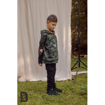 Chlapecké tepláky s obrázkem a maskáčovými lampasy. V pase guma, tkanička na stažení. Praktické kapsy. Měkká teplákovina s jemným chloupkem na rubové straně.