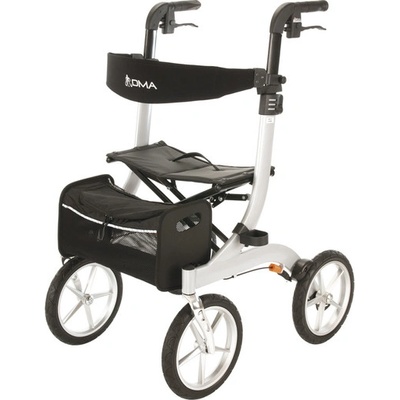 Odlehčené čtyřkolové chodítko s nafukovacími 11″ koly, bovdenovými brzdami s aretací, nastavitelnými madly (85–103 cm), sedátkem a taškou. Vhodné pro venkovní i domácí použití....