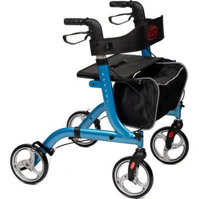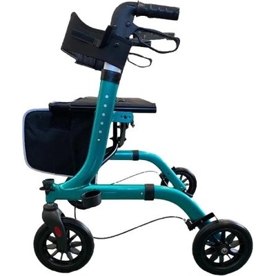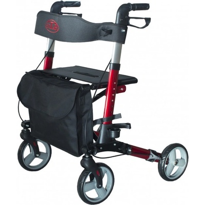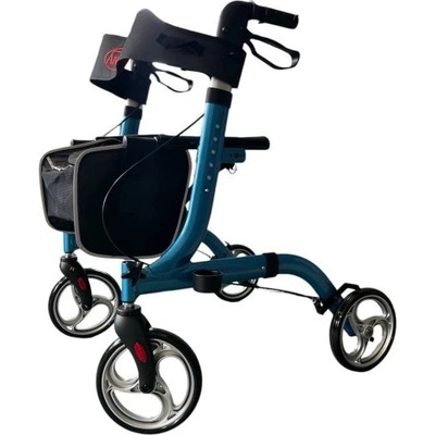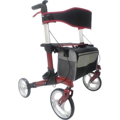 Skládací hliníkové chodítko pro seniory na kolečkách s opěrným pásem, dvěma vodorovnými držadly s polstrováním a taškou na zip. Zdravotní chodítko je dále vybaveno ruční brzdou...