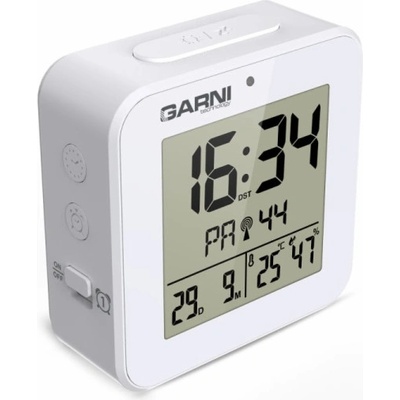 digitální, bateriové napájení, napájení skrze 2 tužkové (AA) baterie, 12 / 24hodinový formát času, čas řízený rádiovým signálem DCF-77 , časová zóna, noční osvětlení, opakované buzení - Snooze, podsvícení displeje a měření relativní vlhkosti (GARNI 138B)
