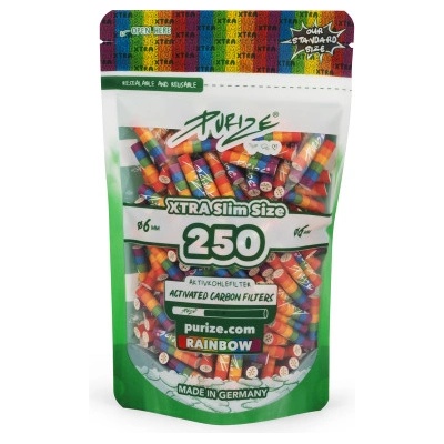 Purize XTRA Slim 5.9mm filtry Rainbow, PE sáček 50 ks Duhové slim filtry s aktivním uhlím PURIZE® aktivně snižují množství škodlivin vzniklých hořením a jsou vyrobeny z...
