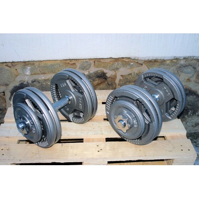 Sada jednoručních činek o celkové váze 2x27,5kg (každá závaží 4x5kg+2x2,5kg), chromové ocelové osy (váha hřídelí 2x2,5kg). Jedná se o nakládací činky, kotouče je možné libovolně...